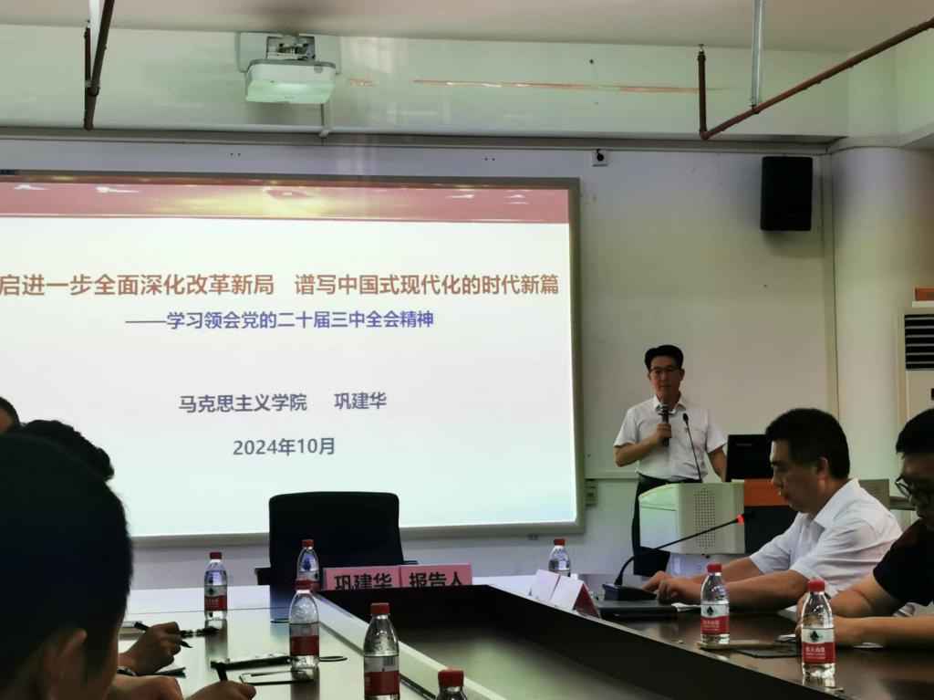 学习贯彻党的二十届三中全会精神宣讲报告会暨学院党委理论学习中心组学习扩大会在体育馆会议室举行,学院党政领导、党委理论学习中心组成员、全体教职工近80人参加报告会。学校党委理论宣讲团成员、马克思主义学院巩建华教授作题为《开启进一步全面深化改革新局,谱写中国式现代化的时代新篇》的宣讲报告,学院党委书记王明对主持会议。