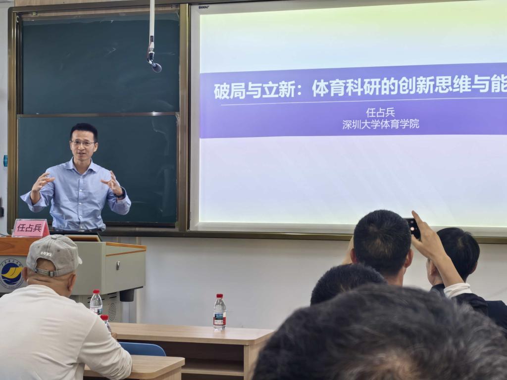 11月6日,深圳大学任占兵教授应邀作了题为《破局与立新:体育科研的创新思维与能力提升》的学术报告。报告系统构建了“破局立新”十大理论体系,聚焦体育人民主体性、体育强国建设、体教融合及数智赋能等前沿议题,为体育学科高质量发展提供了新视角。学院院长周冰教授率师生在广学楼参加本报告会。